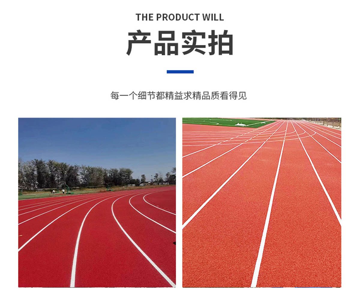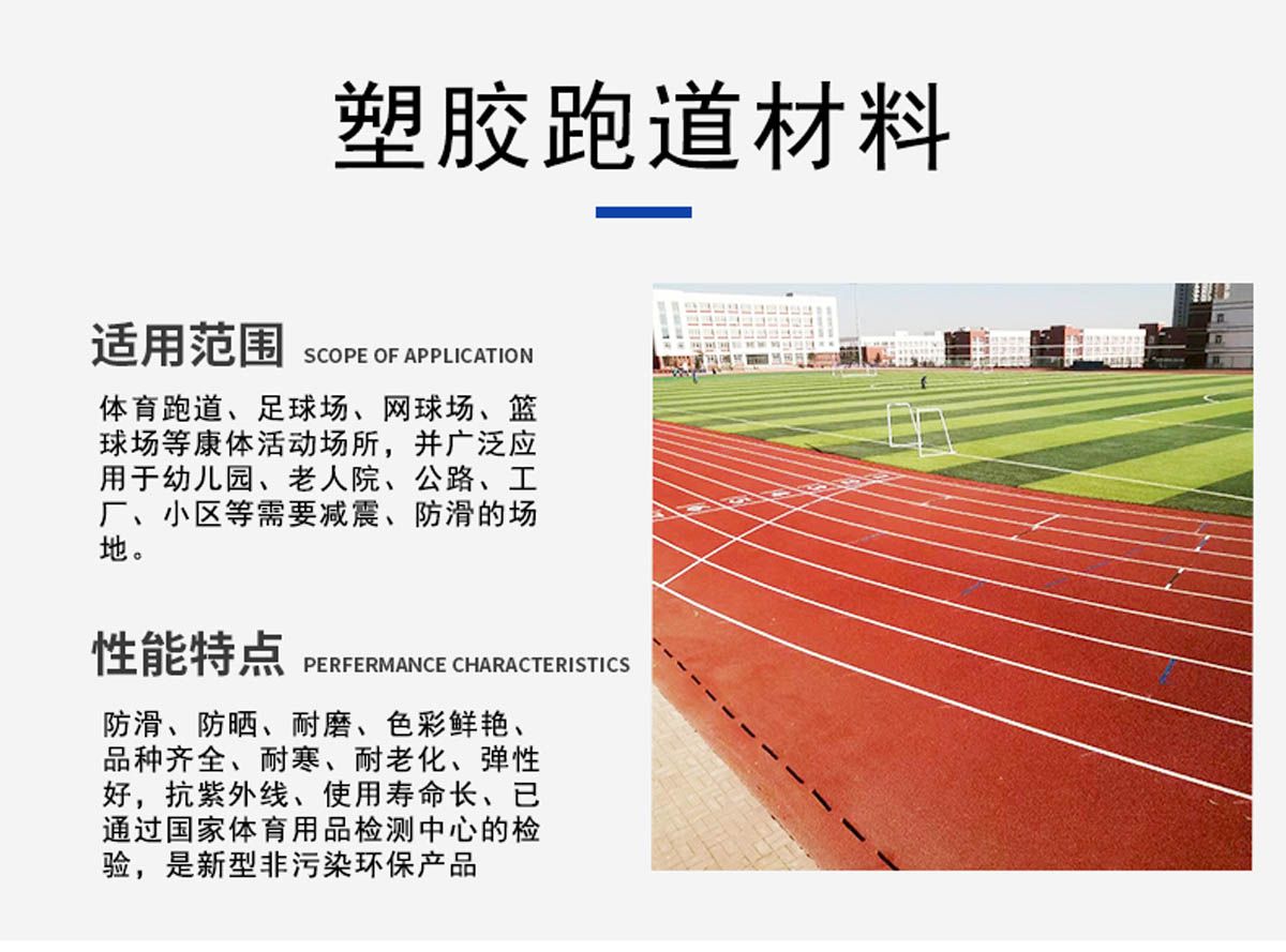 塑胶跑道面层材料主要为聚氨脂(PU)塑胶及三元乙丙(EPDM)橡胶,其优点具有:弹性优良,接着力强、耐磨、耐酸碱、抗老化,全天耐候性、环保、阻燃、防尘、无菌、无接缝、清洁、养护简单,颜色鲜艳、有利于美化环境及提高学生参与运动的兴趣。